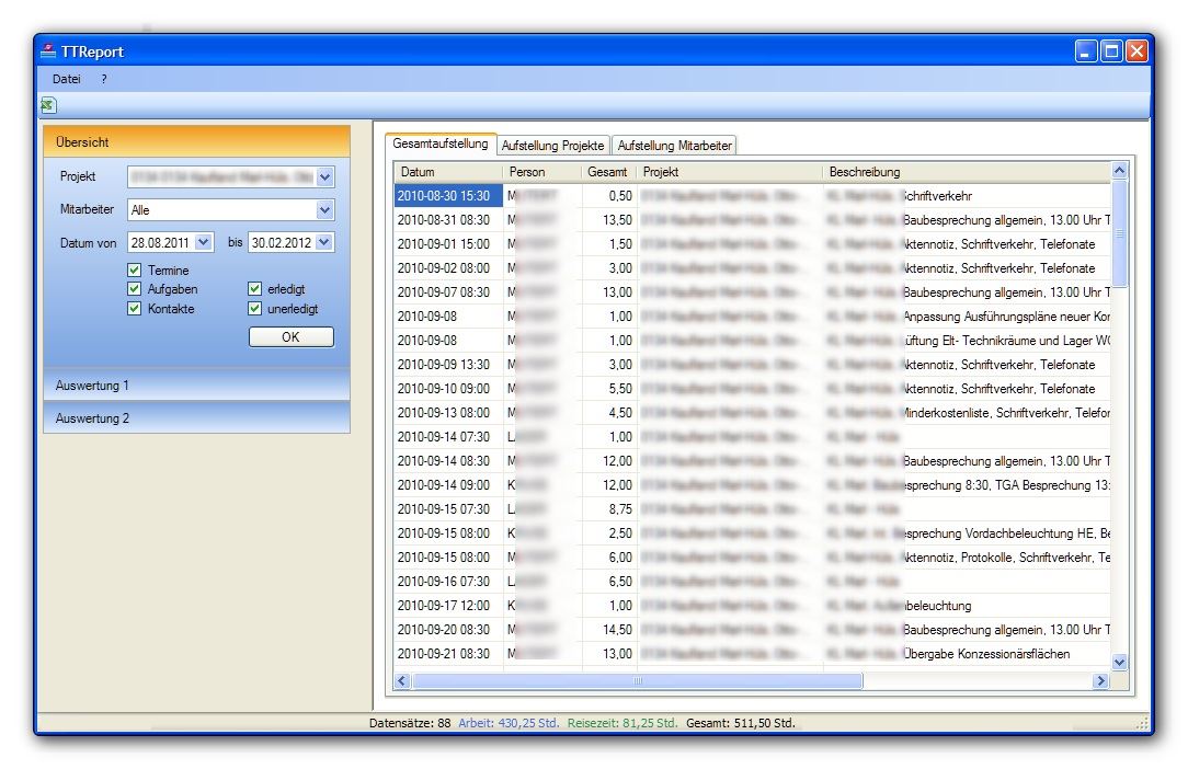 Bereits im Lieferumfang beinhaltet TTReport die Aufstellung von Arbeitszeiten. Hier kann nach Zeitraum, Projekt, Mitarbeiter, erledigt, unerledigt der Datenbestand eingegrenzt werden. Das Ergebnis der Abfrage ist umgehend sichtbar und kann nach Excel exportiert werden.